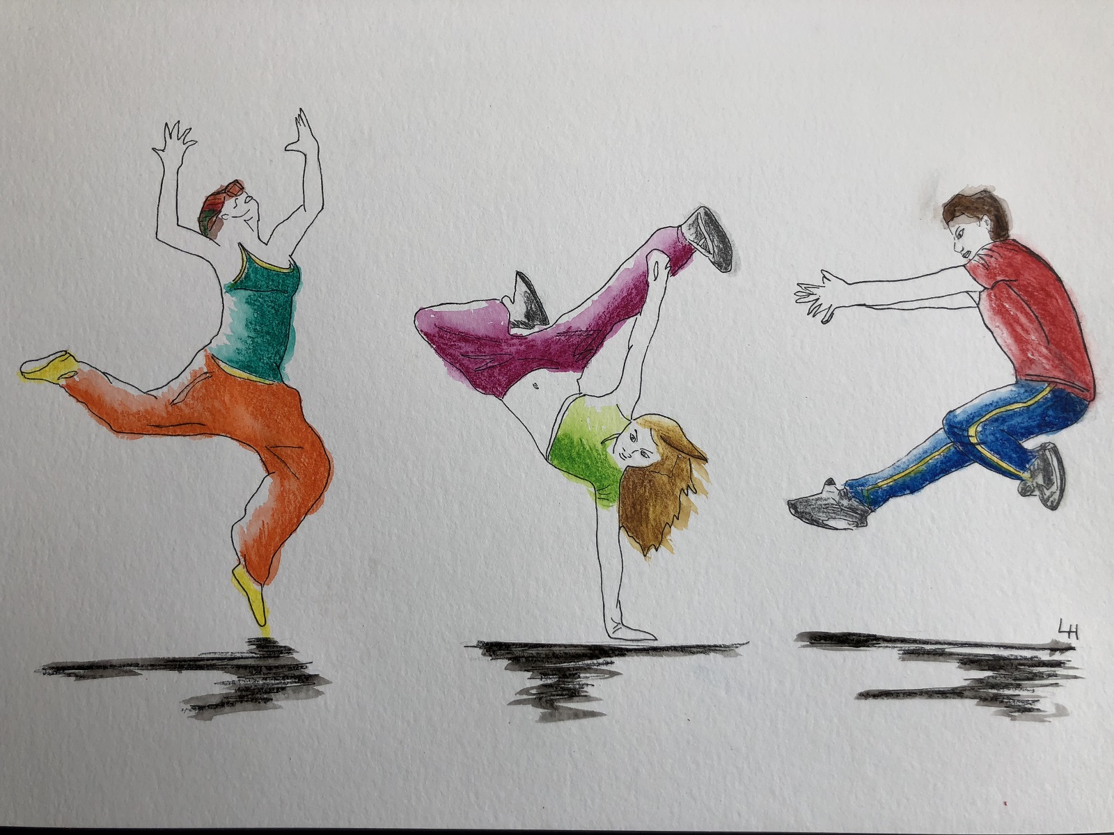 Street dancers on paper with markers, 30 x 40 cm